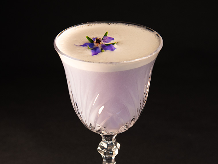 16.-Gin, sirop de myrtille et jus de citron s’accordent dans une fraîcheur cristalline, allongée d’eau gazeuse.